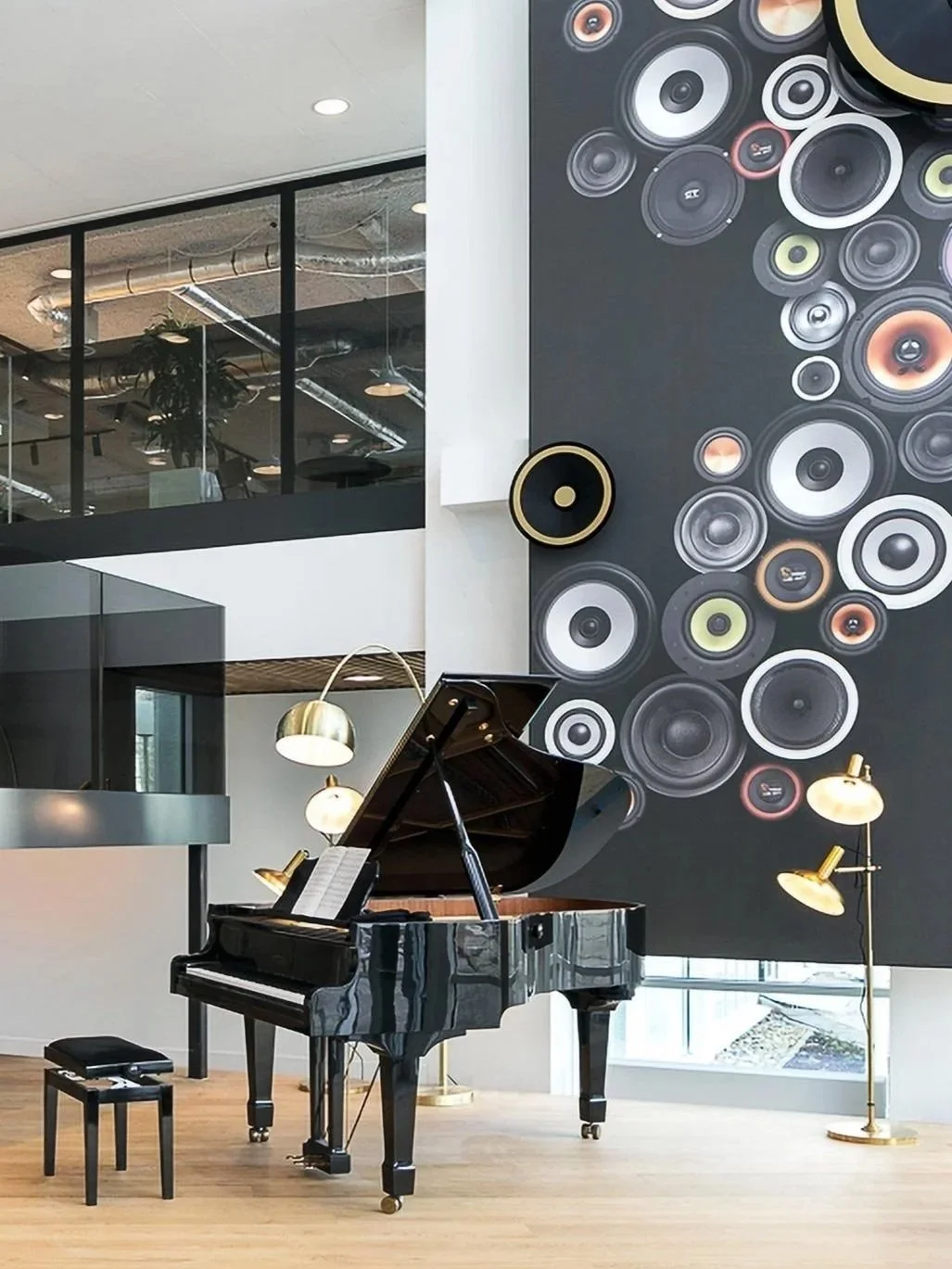 Buma Stemra’s headquarters in Hoofddorp has been rethought as a creative, user-focused workplace that mirrors the organisation’s connection to music, culture, and innovation. The redesign introduces a range of flexible spaces, including acoustically optimised meeting rooms, private work pods, relaxed lounges, and a multifunctional café. The heart of the building—featuring a striking piano stage—acts as a cultural gesture, inviting moments of spontaneity and performance into the workday.