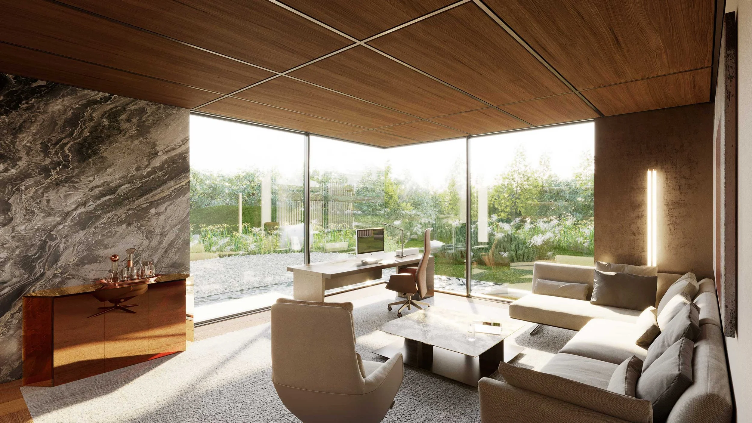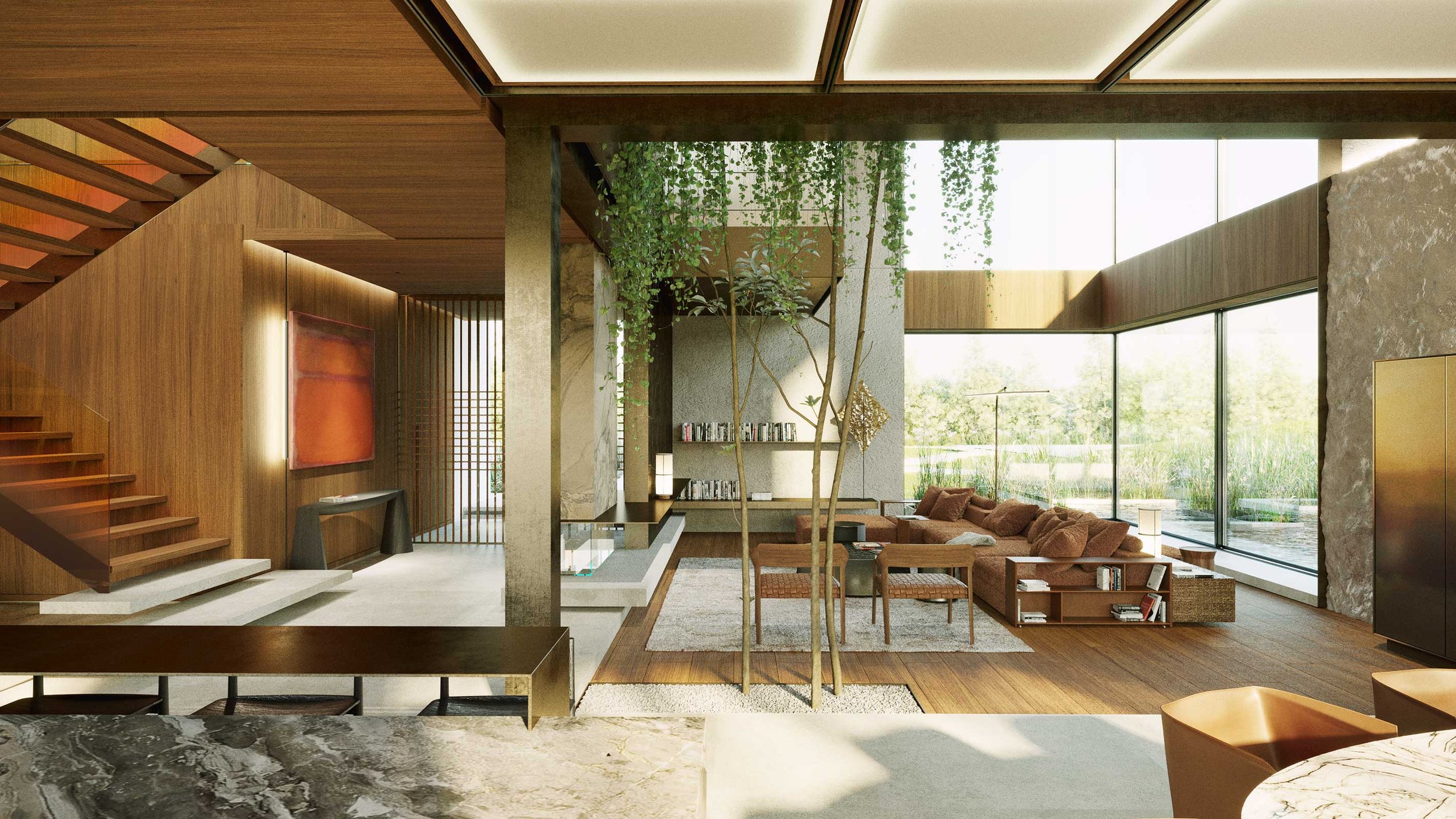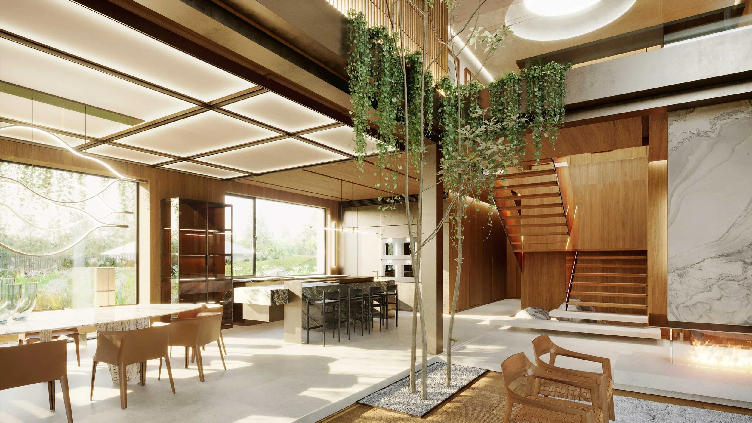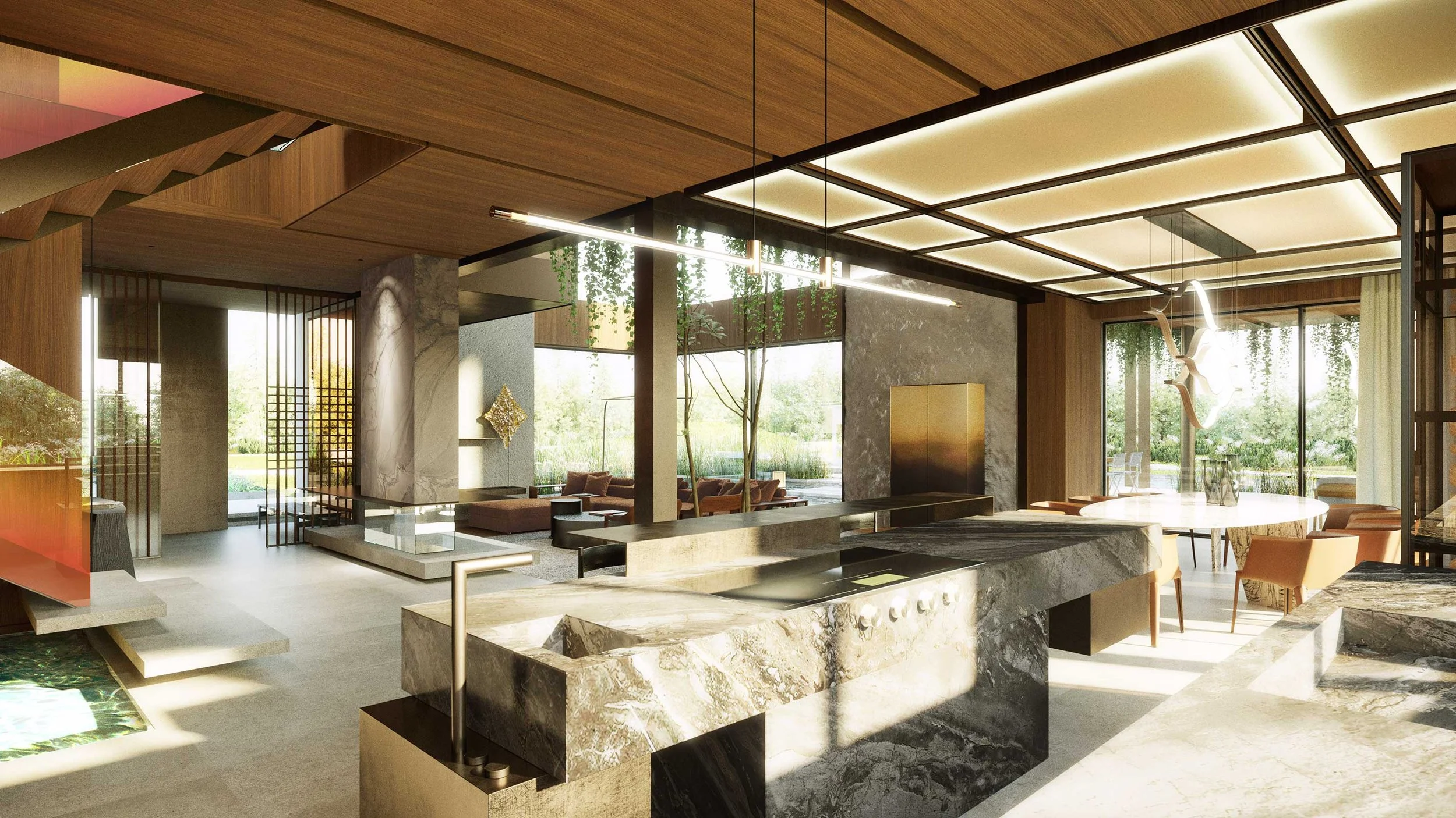 The residence’s design features walls clad in rich wooden panels and expansive stone slabs, creating a tactile, elegant backdrop. The ceiling is a statement in itself—wooden panels set within sleek metal frames seamlessly integrate architectural lighting, HVAC grilles, and access panels for electric blinds, merging function and design with subtle sophistication.