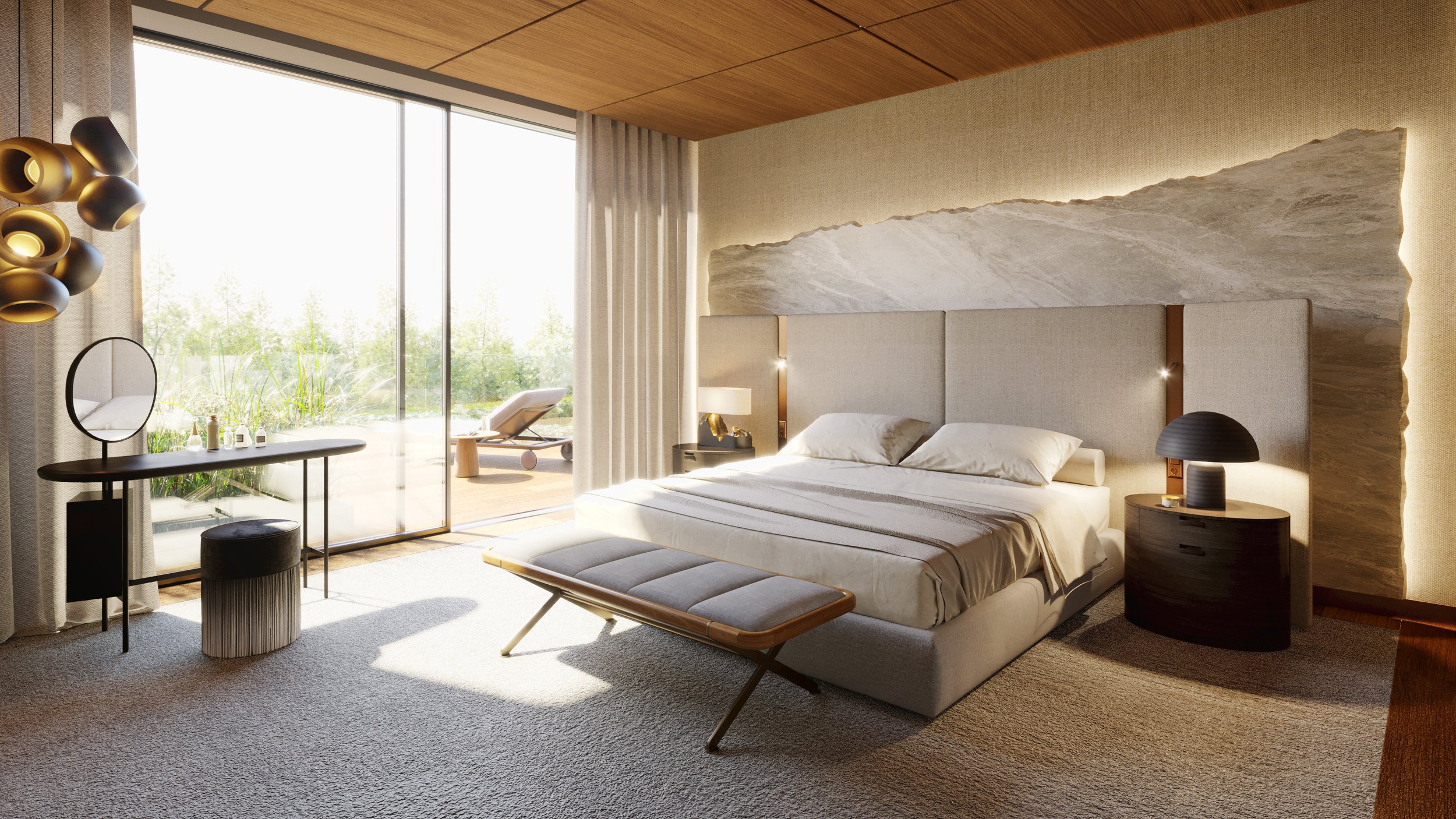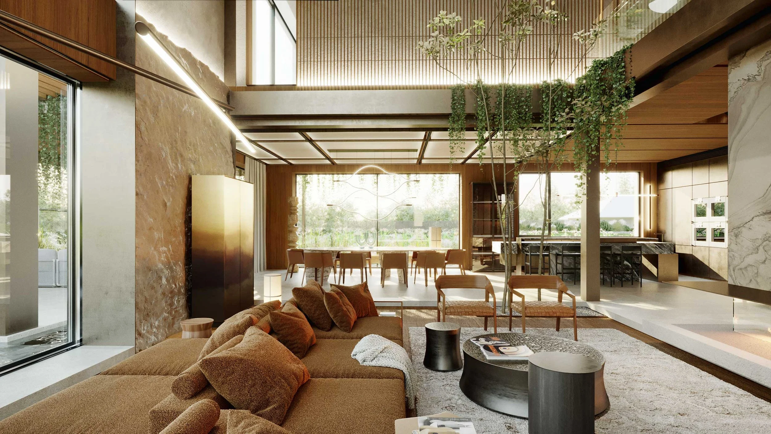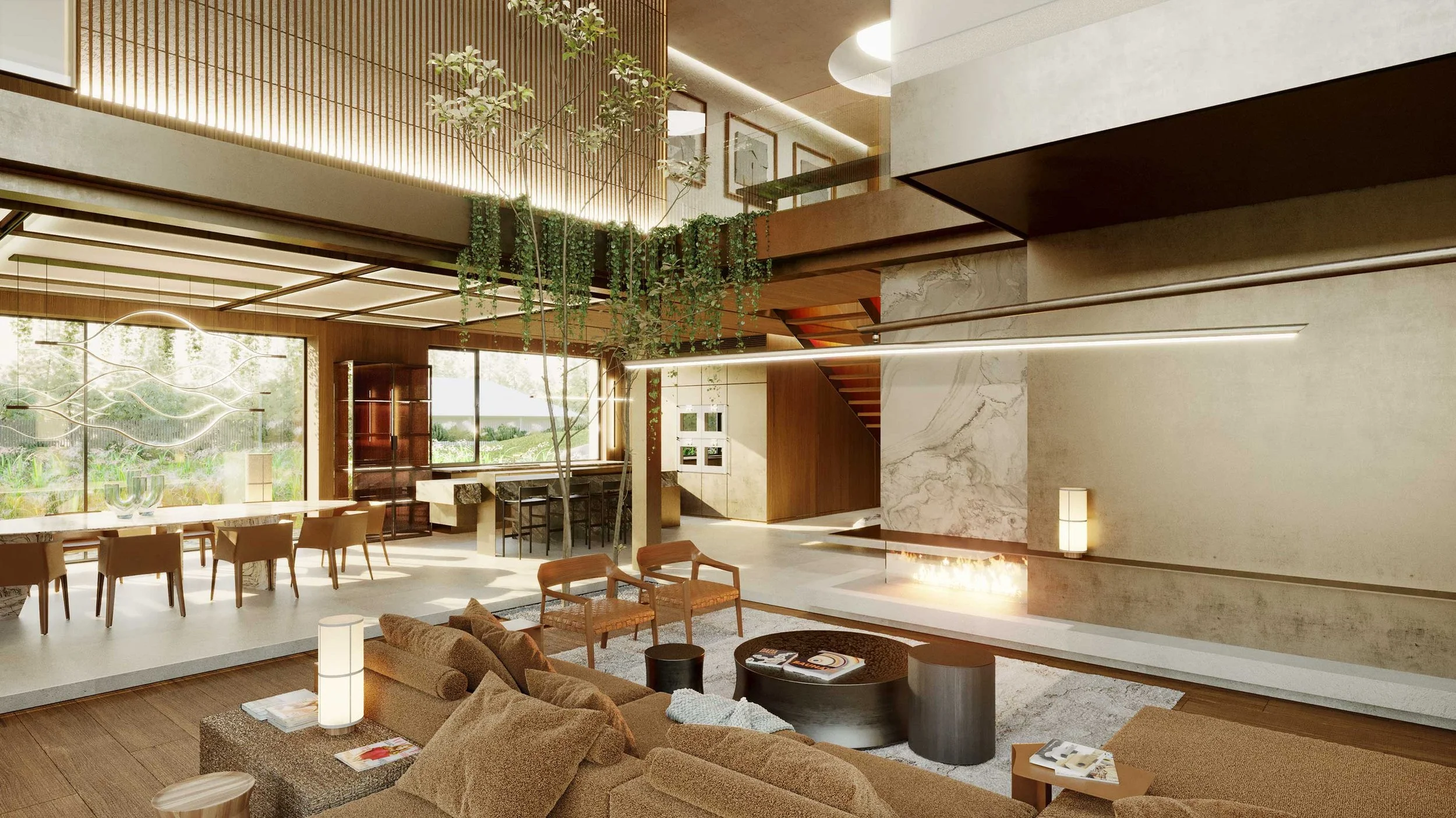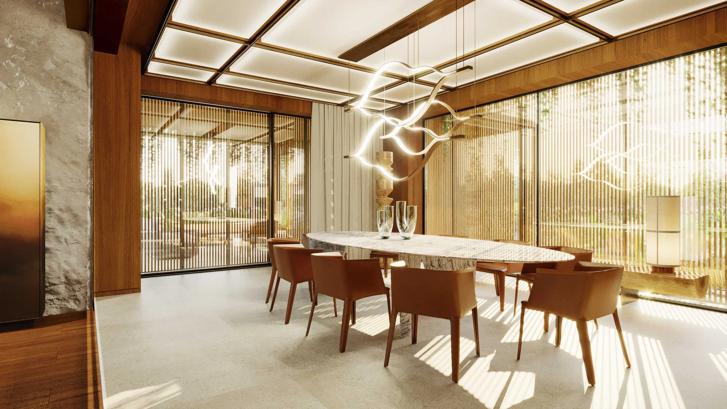 The residence’s design features walls clad in rich wooden panels and expansive stone slabs, creating a tactile, elegant backdrop. The ceiling is a statement in itself—wooden panels set within sleek metal frames seamlessly integrate architectural lighting, HVAC grilles, and access panels for electric blinds, merging function and design with subtle sophistication.