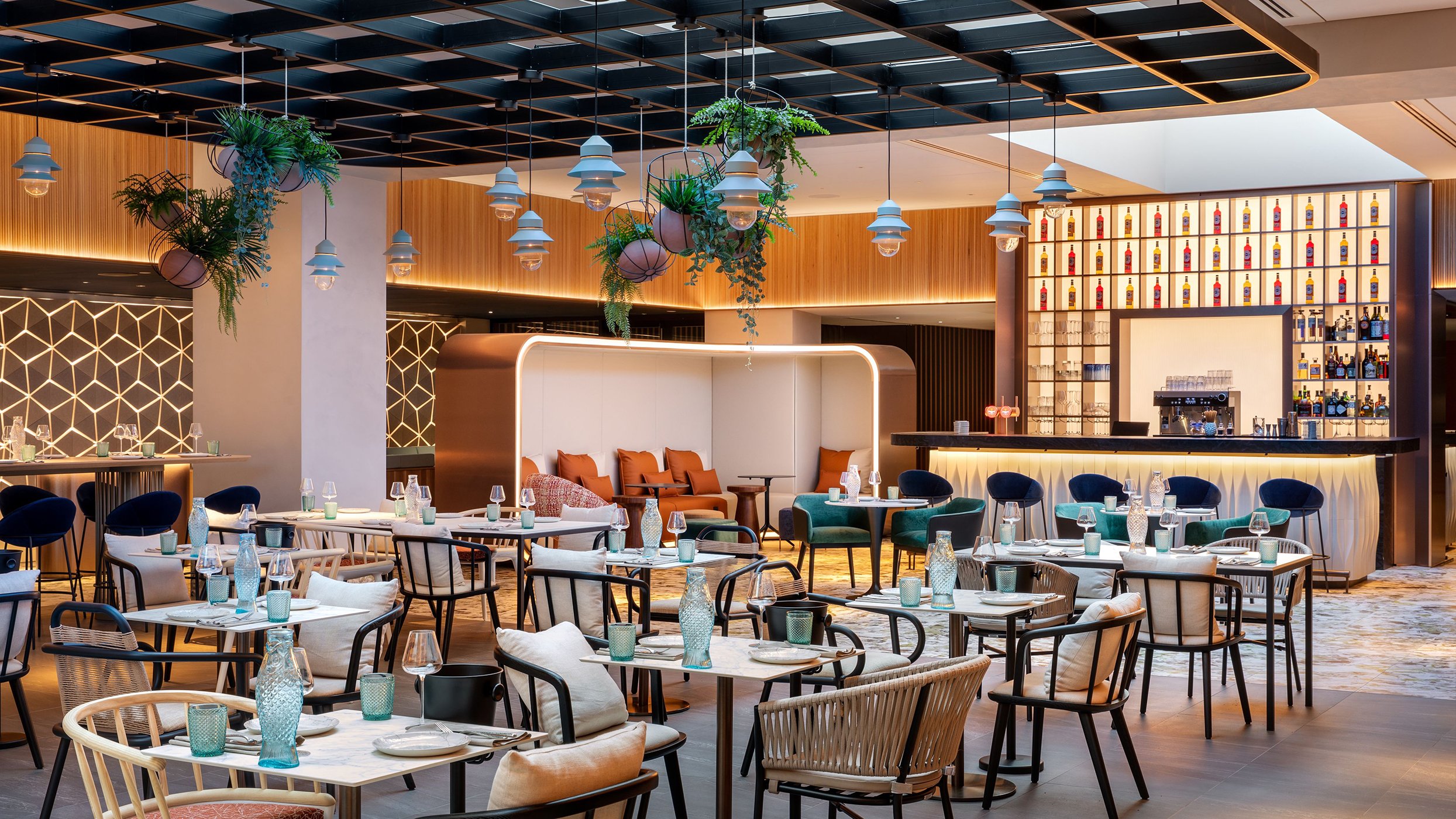 Za’atar Bar pairs fresh Mediterranean flavours with panoramic views. Its vibrant interior features woven wood, eclectic seating, and lush greenery in a relaxed setting.